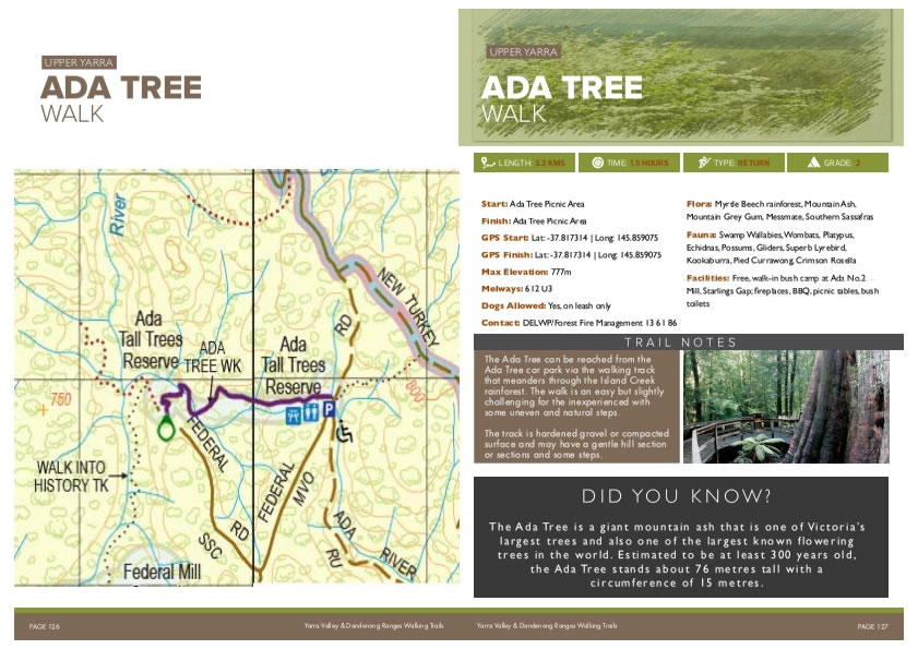 From Warburton follow Warburton-Woods Point Road, Brahams Road, Big Creek Road to the east and Ada River Road. From Powelltown - Noojee Road either take Big Creek Road (east of Powelltown) or New Turkey Road (west of Noojee) to access the Ada Tree car park on Ada River Road.