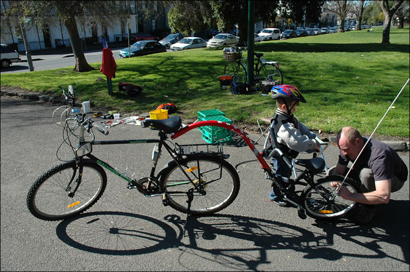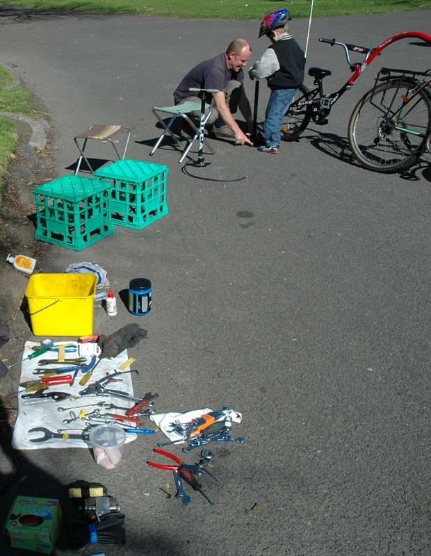 A special group of bike lovers greets riders at the north gate of Carlton Gardens with a free bike fix service.