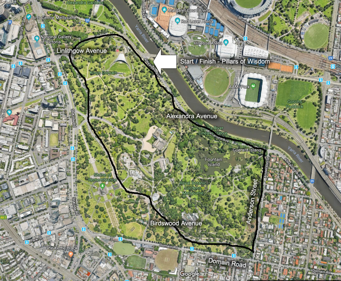The official start point of a clockwise lap is at the Pillars of Wisdom near the junction of Alexandra Avenue and Olympic Boulevard (opposite Swan Street bridge).