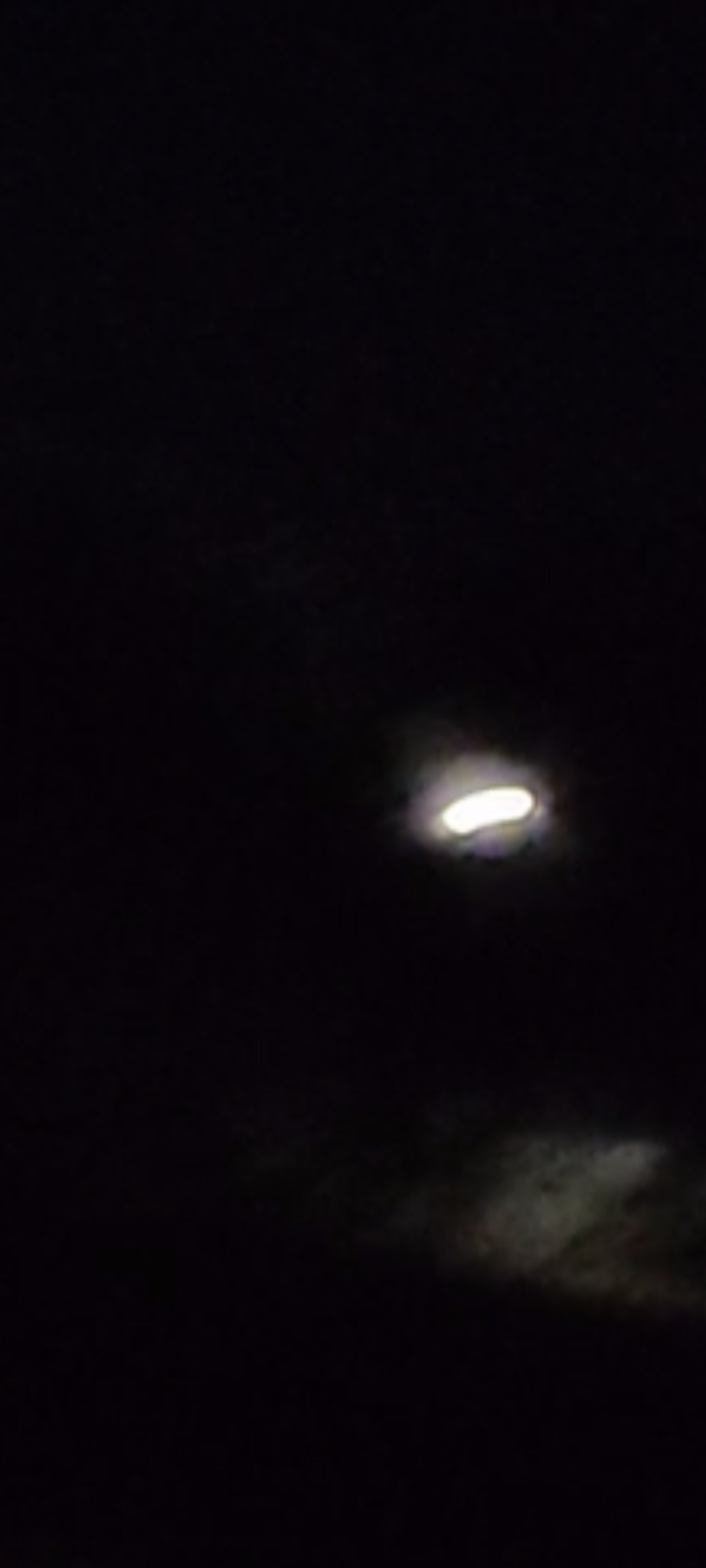 I shut one eye briefly to make sure I wasn't getting a double image and counted 7 lights around the edges. I got some pretty poor photos and a worse video, however in more than 3 photos you can tell the light source is behind the cloud which is obscuring it. This means it can't be light from the moon reflecting back. Once the clouds had thickened up and we could no longer see it, we headed off, and I later recorded the compass bearing and angle of inclination to the last point we saw it. I had tried holding the phone camera against the binoculars but that was ineffective as the phone camera has dual lenses so it wouldn't focus.