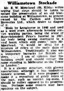 During the years the old Stockade, together with its large yard and out-buildings, was taken over as a depot for scrap-iron, and a portion of the premises is now in use as a woodyard. Surely such an historic old building is deserving of a better fate! Situated in Nelson Place, within a stone's throw of the Williamstown Post Office, it is easily located by strangers to the town and might easily be made more attractive to visitors. It should, at least, be preserved as a link with the early days of Settlement in Australia. Green lawns, colourful flower beds and gravel paths could well replace the scattered junk heap, stacks of firewood and ramshackle outbuildings of the yard. The ancient building might well be turned into a maritime museum. There are many interesting relics of the early days of shipping in Hobson's Bay and of the settlement at William's Town which might well be safely housed within the solid bluestone walls of Melbourne's oldest building.